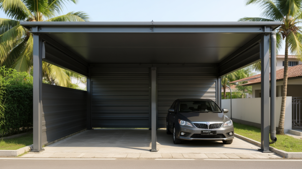 Spandek tersedia dalam berbagai ketebalan — dari 0,25 mm hingga 0,45 mm — dan pilihannya harus disesuaikan dengan fungsi kanopi. Untuk carport rumah, ketebalan 0,30–0,35 mm sudah cukup kuat. Untuk gudang atau area komersial, kami sarankan minimal 0,40 mm agar tahan beban angin dan hujan lebat Medan.