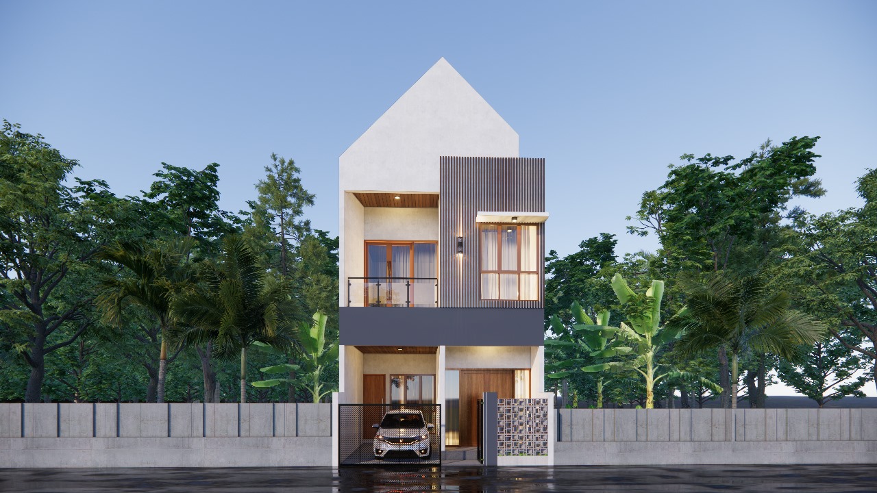 - Eksterior: Fasad sederhana dengan elemen kayu, pagar minimalis.