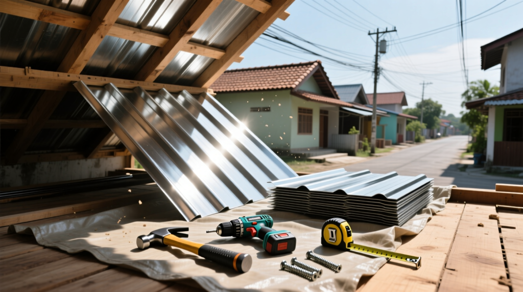 Anda memerlukan seng zincalume/galvalum berkualitas, sekrup atap berlapis anti karat dengan karet washer, palu karet, bor listrik, meteran baja, gunting seng, dan sealant silikon khusus atap. Semua bahan ini bisa Anda beli lengkap di Jaya Intero dengan harga paket hemat dan kualitas terjamin untuk iklim Sumatera.