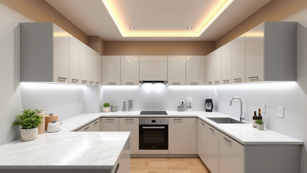 Kami menyarankan penggunaan lampu LED strip di bagian bawah lemari gantung untuk pencahayaan tambahan saat memasak atau membersihkan.