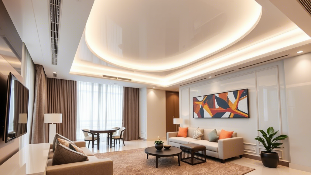 Misalnya, jika Anda memiliki ruang tamu dengan langit-langit rendah, plafon hotel dengan finishing glossy dapat memberikan ilusi optik yang membuat ruangan terlihat lebih tinggi dan luas.
