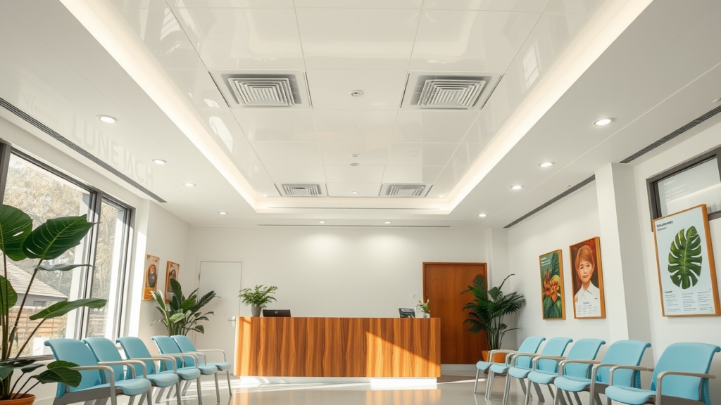 Kombinasi antara desain sederhana dan pencahayaan modern membuat plafon klinik menjadi investasi jangka panjang yang sangat menguntungkan bagi bisnis medis Anda.