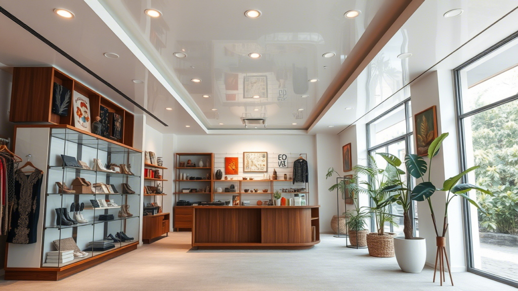 Misalnya, jika Anda memiliki toko dengan langit-langit rendah, plafon toko dengan finishing glossy dapat memberikan ilusi optik yang membuat ruangan terlihat lebih tinggi dan luas.