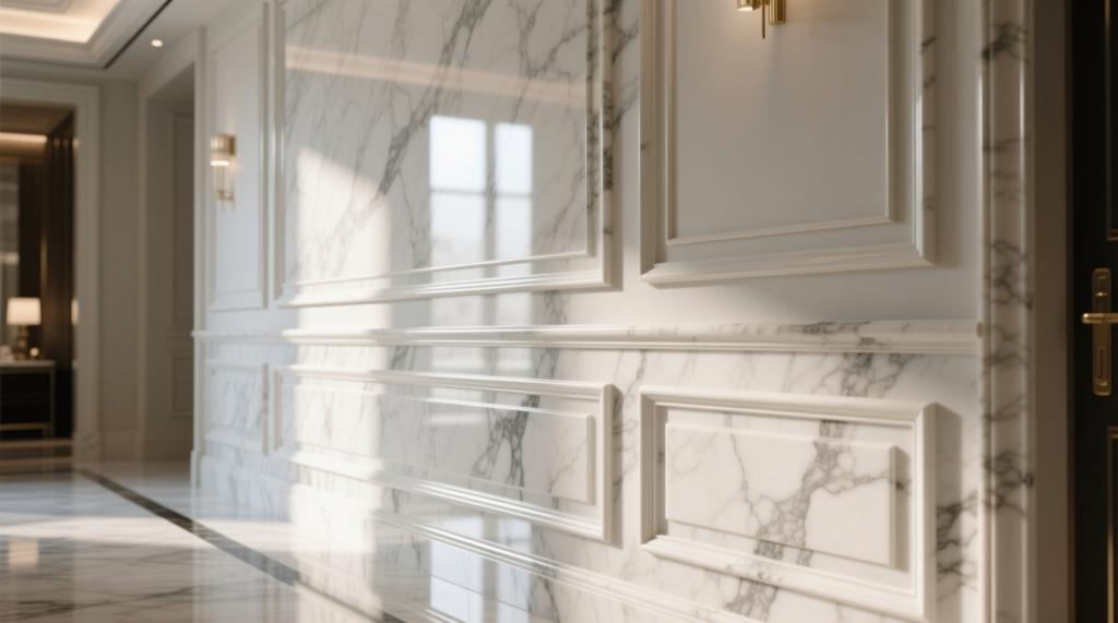 Moulding dinding marmer sangat fleksibel dan bisa digunakan di berbagai jenis ruangan, seperti ruang tamu, ruang makan, atau bahkan area komersial. Namun, perlu dipertimbangkan tingkat kelembapan ruangan. Misalnya, marmer asli kurang cocok untuk area basah seperti kamar mandi karena rentan terhadap noda air. Untuk area seperti itu, marmer sintetis bisa jadi pilihan yang lebih baik.