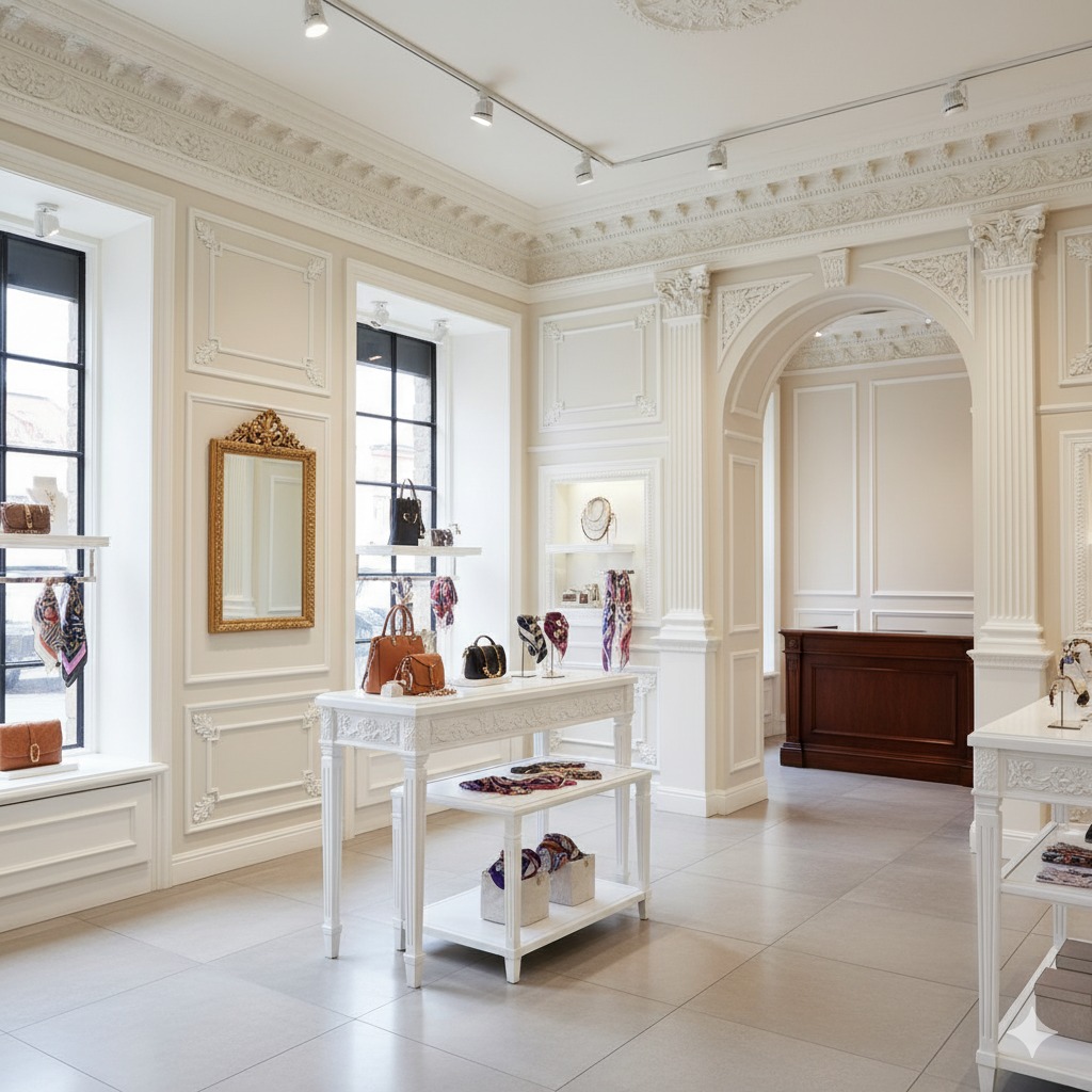Moulding dapat memberikan kesan elegan, menambah nilai estetika, serta membuat toko terlihat lebih rapi dan profesional. Selain itu, moulding juga dapat menutupi celah dinding atau plafon sehingga tampilan toko lebih bersih dan menarik bagi pengunjung.